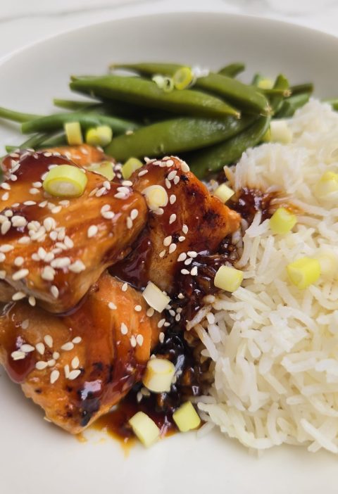 Saumon Teriyaki en dés, riz basmati et légumes verts (méthode traditionelle & Thermomix)