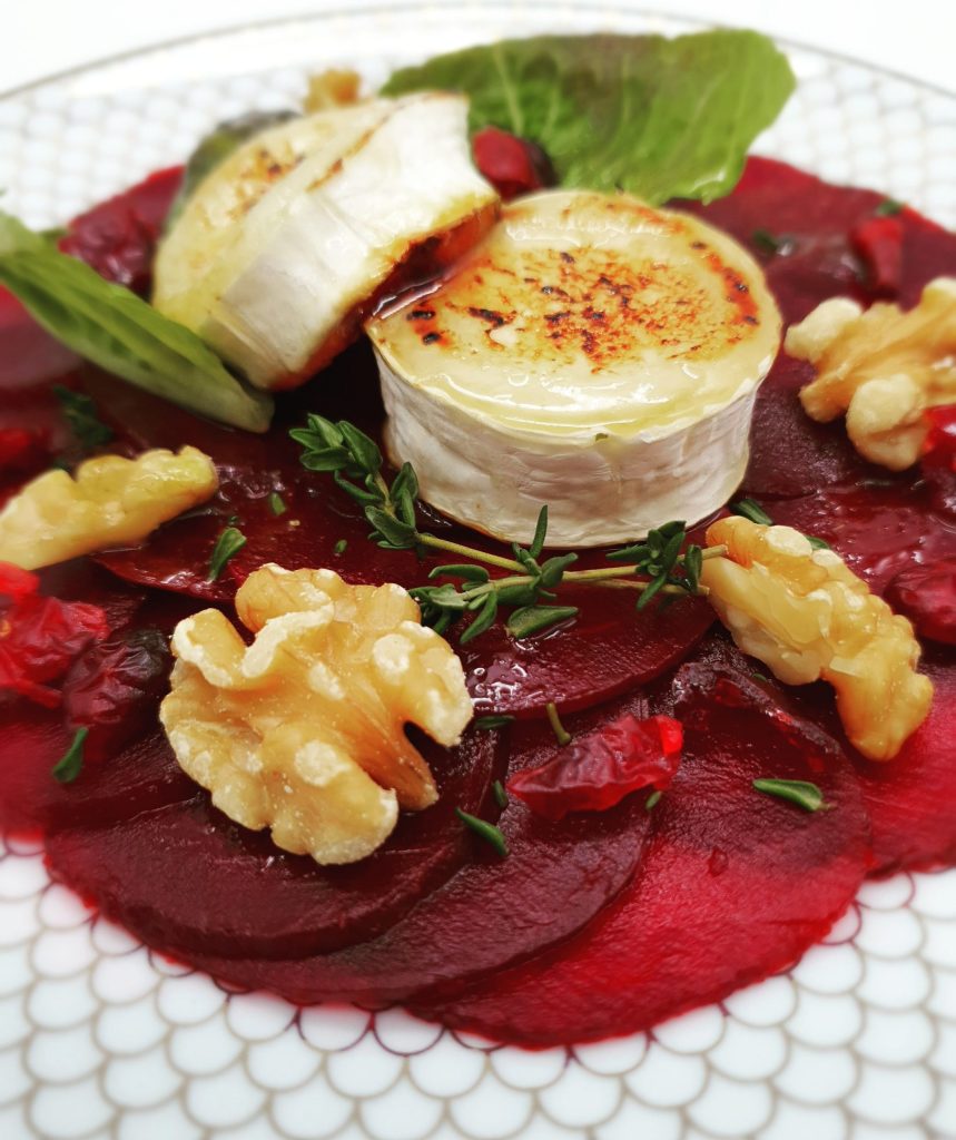Ce carpaccio est l’une de mes alternatives végétariennes préférées à Noël, quand ma belle-famille mange des huîtres. Je le prépare avec du fromage de chèvre, mais on peut aussi le faire avec du camembert pour varier. Visuellement superbe, ce plat offre un équilibre parfait entre le sucré du miel, le fondant du fromage chaud, l’acidité de la vinaigrette et le croquant des noix. Une vraie assiette de fête !